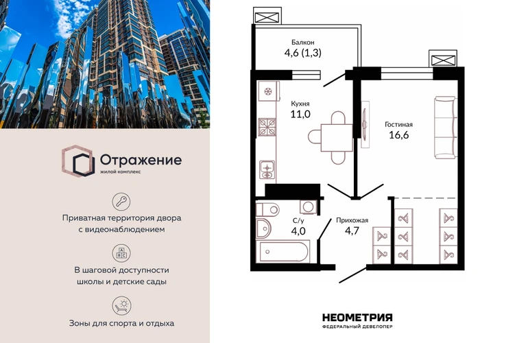 Продается квартира в жилом комплексе «Отражение». Это новый стандарт комфортного проживания от федерального девелопера «Неометрия». Дом сдан — получайте ключи в день сделки, и празднуйте новоселье уже сегодня! Современный проект комфорт-класса впечатляет передовыми архитектурными и технологическими решениями, гармонично вписываясь в окружающую среду и подчеркивая индивидуальность каждого жителя. Комплекс обладает уникальной концепцией двор-парка «Страна чудес», где созданы условия для активной жизни, отдыха и семейной гармонии. Пространство включает разнообразные тематические зоны: площадь звуков и театр теней, многофункциональные спортивные площадки для футбола, баскетбола, йоги и аэробики, живописные беседки и уголки для релаксации. Особое внимание уделено безопасности: вся территория комплекса является закрытой с круглосуточным видеонаблюдением. Доступ разрешен только жителям создавая атмосферу защищенности и уединения. Жилой комплекс «Отражение», расположенный в привлекательном районе Западного обхода, предлагает жителям комфортное проживание в сочетании с развитой инфраструктурой и близостью природы. Здесь созданы идеальные условия для жизни и отдыха всех членов семьи. Преимущества расположения комплекса: Магазины: В шаговой доступности находится гипермаркет «Семейный Магнит» и магазин строительных материалов «Лемана ПРО». Торговля и досуг: Рядом располагается торговый центр «Красная площадь», предлагающий широкий ассортимент товаров известных брендов, современные кинотеатры, разнообразные рестораны национальной и международной кухни, а также площадки для детского отдыха и развлечений. Образование: Образование гарантировано высоким уровнем школ №95, №96 и №98, а также детских садов №108 и №100, расположенных неподалеку. Спорт и активный образ жизни: Возможность занятий спортом обеспечивается футбольной академией «Краснодар», спортивными комплексами «Баскет-Холл» и ЦСКА, предоставляющими доступ к тренировкам разных видов спорта и участию в крупных международных мероприятиях. Благодаря продуманному расположению и наличию всего необходимого под рукой, жители жилого комплекса «Отражение» получают уникальную возможность наслаждаться жизнью в гармонии с природой и удобствами современного города. Квартиры предлагаются с готовой премиальной отделкой Prime - обеспечивающей максимальный уровень комфорта, удобства и долговечности используемых материалов. Это гарантирует каждому владельцу стильный интерьер, оптимально подходящий для современного ритма жизни. (AQID02535166)О застройщике