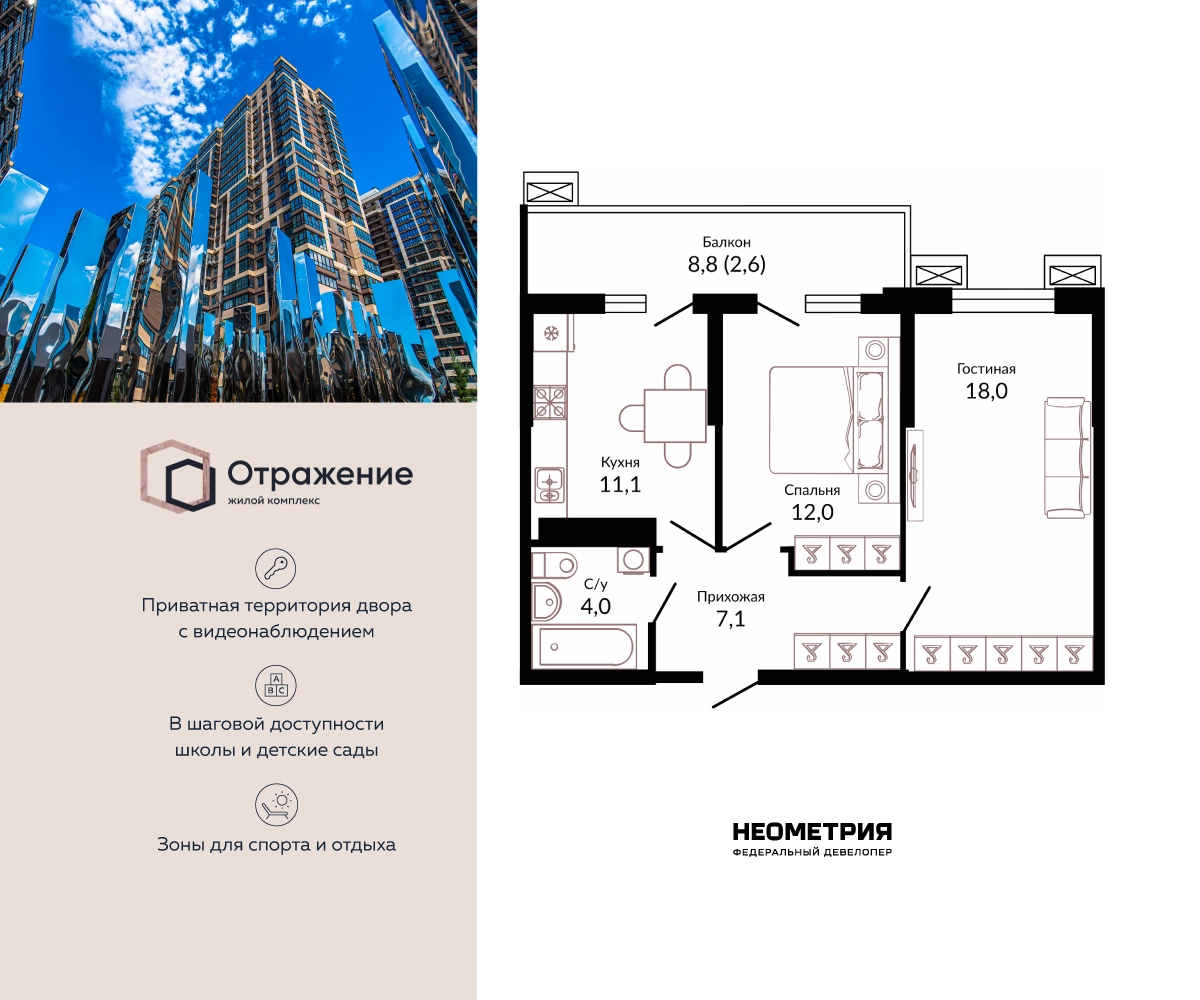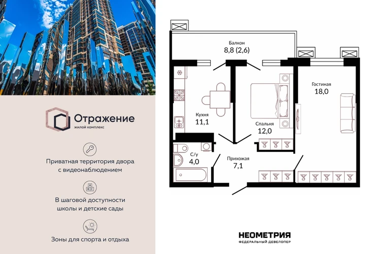 Продается квартира в жилом комплексе «Отражение». Это новый стандарт комфортного проживания от федерального девелопера «Неометрия». Дом сдан — получайте ключи в день сделки, и празднуйте новоселье уже сегодня! Современный проект комфорт-класса впечатляет передовыми архитектурными и технологическими решениями, гармонично вписываясь в окружающую среду и подчеркивая индивидуальность каждого жителя. Комплекс обладает уникальной концепцией двор-парка «Страна чудес», где созданы условия для активной жизни, отдыха и семейной гармонии. Пространство включает разнообразные тематические зоны: площадь звуков и театр теней, многофункциональные спортивные площадки для футбола, баскетбола, йоги и аэробики, живописные беседки и уголки для релаксации. Особое внимание уделено безопасности: вся территория комплекса является закрытой с круглосуточным видеонаблюдением. Доступ разрешен только жителям создавая атмосферу защищенности и уединения. Жилой комплекс «Отражение», расположенный в привлекательном районе Западного обхода, предлагает жителям комфортное проживание в сочетании с развитой инфраструктурой и близостью природы. Здесь созданы идеальные условия для жизни и отдыха всех членов семьи. Преимущества расположения комплекса: Магазины: В шаговой доступности находится гипермаркет «Семейный Магнит» и магазин строительных материалов «Лемана ПРО». Торговля и досуг: Рядом располагается торговый центр «Красная площадь», предлагающий широкий ассортимент товаров известных брендов, современные кинотеатры, разнообразные рестораны национальной и международной кухни, а также площадки для детского отдыха и развлечений. Образование: Образование гарантировано высоким уровнем школ №95, №96 и №98, а также детских садов №108 и №100, расположенных неподалеку. Спорт и активный образ жизни: Возможность занятий спортом обеспечивается футбольной академией «Краснодар», спортивными комплексами «Баскет-Холл» и ЦСКА, предоставляющими доступ к тренировкам разных видов спорта и участию в крупных международных мероприятиях. Благодаря продуманному расположению и наличию всего необходимого под рукой, жители жилого комплекса «Отражение» получают уникальную возможность наслаждаться жизнью в гармонии с природой и удобствами современного города. Квартиры предлагаются с готовой премиальной отделкой Prime - обеспечивающей максимальный уровень комфорта, удобства и долговечности используемых материалов. Это гарантирует каждому владельцу стильный интерьер, оптимально подходящий для современного ритма жизни. (AQID02535397)О застройщике