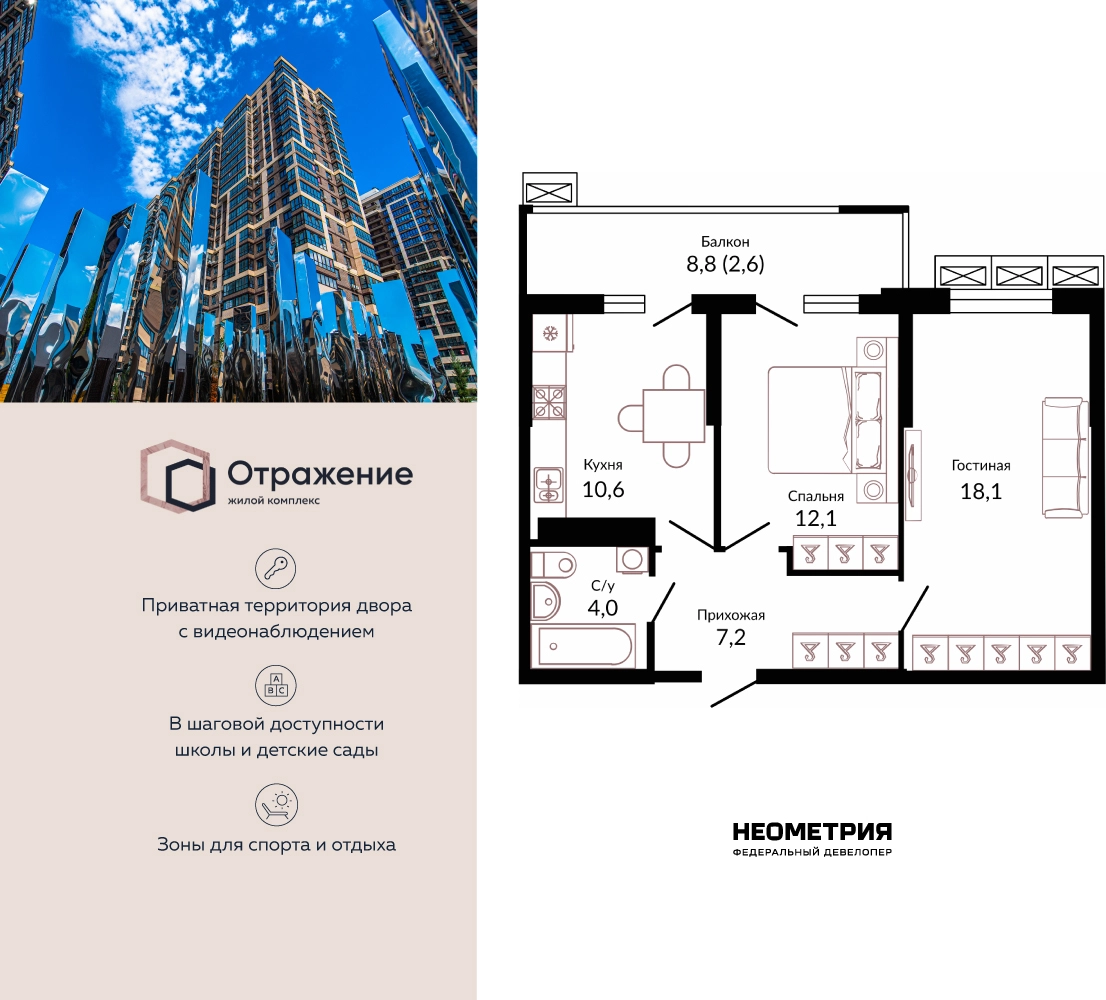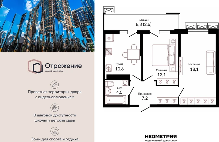 Продается квартира в жилом комплексе «Отражение». Это новый стандарт комфортного проживания от федерального девелопера «Неометрия». Дом сдан — получайте ключи в день сделки, и празднуйте новоселье уже сегодня! Современный проект комфорт-класса впечатляет передовыми архитектурными и технологическими решениями, гармонично вписываясь в окружающую среду и подчеркивая индивидуальность каждого жителя. Комплекс обладает уникальной концепцией двор-парка «Страна чудес», где созданы условия для активной жизни, отдыха и семейной гармонии. Пространство включает разнообразные тематические зоны: площадь звуков и театр теней, многофункциональные спортивные площадки для футбола, баскетбола, йоги и аэробики, живописные беседки и уголки для релаксации. Особое внимание уделено безопасности: вся территория комплекса является закрытой с круглосуточным видеонаблюдением. Доступ разрешен только жителям создавая атмосферу защищенности и уединения. Жилой комплекс «Отражение», расположенный в привлекательном районе Западного обхода, предлагает жителям комфортное проживание в сочетании с развитой инфраструктурой и близостью природы. Здесь созданы идеальные условия для жизни и отдыха всех членов семьи. Преимущества расположения комплекса: Магазины: В шаговой доступности находится гипермаркет «Семейный Магнит» и магазин строительных материалов «Лемана ПРО». Торговля и досуг: Рядом располагается торговый центр «Красная площадь», предлагающий широкий ассортимент товаров известных брендов, современные кинотеатры, разнообразные рестораны национальной и международной кухни, а также площадки для детского отдыха и развлечений. Образование: Образование гарантировано высоким уровнем школ №95, №96 и №98, а также детских садов №108 и №100, расположенных неподалеку. Спорт и активный образ жизни: Возможность занятий спортом обеспечивается футбольной академией «Краснодар», спортивными комплексами «Баскет-Холл» и ЦСКА, предоставляющими доступ к тренировкам разных видов спорта и участию в крупных международных мероприятиях. Благодаря продуманному расположению и наличию всего необходимого под рукой, жители жилого комплекса «Отражение» получают уникальную возможность наслаждаться жизнью в гармонии с природой и удобствами современного города. Квартиры предлагаются с готовой премиальной отделкой Prime - обеспечивающей максимальный уровень комфорта, удобства и долговечности используемых материалов. Это гарантирует каждому владельцу стильный интерьер, оптимально подходящий для современного ритма жизни. (AQID02544268)О застройщике
